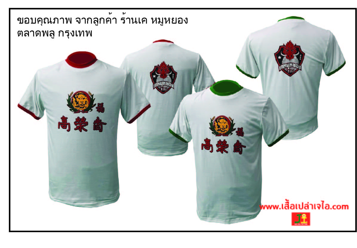 งานรับทำเสื้อยืดกุ้นคอ กุ้นแขนสกรีน โลโก้ ของร้านเคหมูหยอง